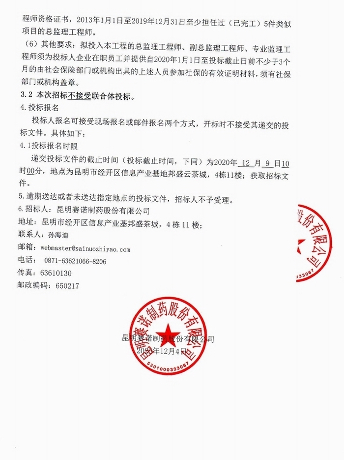 昆明賽諾制藥股份有限公司《中藥原料藥提取基地和綜合生產(chǎn)車間建設(shè)項(xiàng)目》建設(shè)工程監(jiān)理招標(biāo)公告