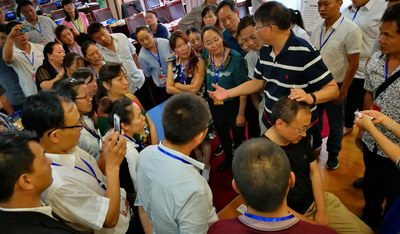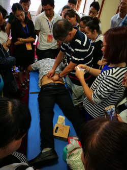 魏教授演示背部點(diǎn)揉法,基層醫(yī)生學(xué)員們將魏教授團(tuán)團(tuán)圍住,邊聽邊看邊記錄,學(xué)習(xí)熱情高漲。演示模特均由學(xué)員自愿擔(dān)任,圖中女醫(yī)生當(dāng)時(shí)正好左上腹疼痛,經(jīng)魏教授點(diǎn)揉、拔/走罐等治療后,疼痛立解。立竿見影的治療效果大大提升了醫(yī)生們的信心。